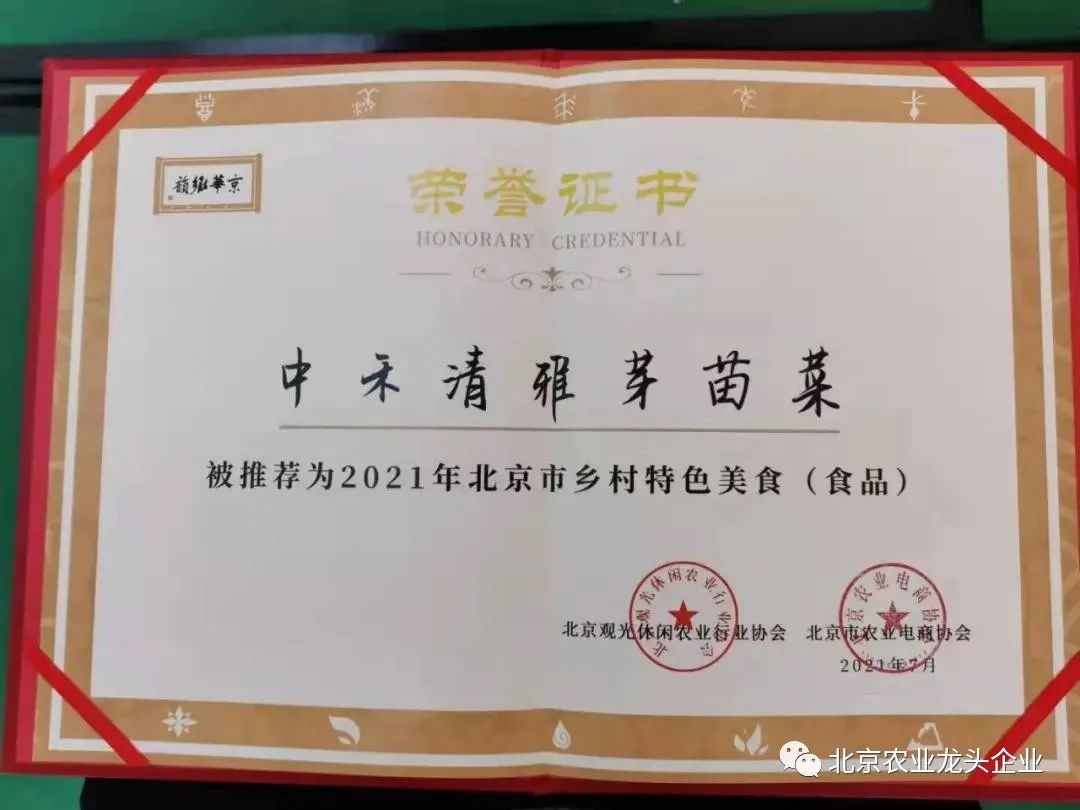 2015年1月21日,中禾清雅成为第一家获得芽苗菜全国工业产品生产许可证的农业企业,打响了农产品工业化生产的第一枪,为彻底解决蔬菜安全问题奠定了基础。并于2017年12月22日更换食品生产许可证,由“QS”标识升级为“SC”标识。公司注册使用的商标包括“福来芽”和“中禾清雅”,现今与众多商超合作,共同保障北京市菜篮子工程需求,稳定市场。