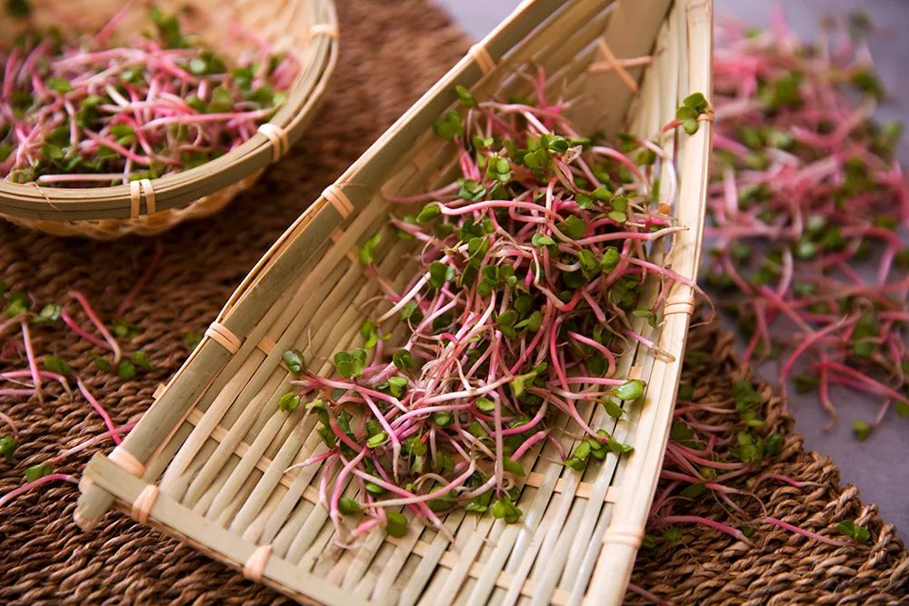 8、采收:经过绿化培养 72 小时后的萝卜芽,芽高一般达到13~15 厘米,叶色翠绿,茎和根呈白色,即可采收。