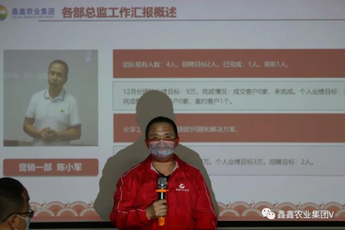 会议的尾声,鑫鑫农业集团董事吕能俊进行总结发言,首先对12月份营销工作中涌现的突出个人和优秀团队予以充分肯定和表扬,对存在的问题一一指正。