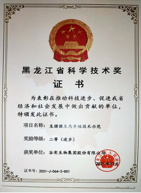 企迪网讯(编辑刘欣)近日,北京黑龙江企业商会理事单位——谷实生物集团股份有限公司《生猪微生态养殖技术示范》项目,荣获2021年度黑龙江省“科技进步二等奖”。该奖项是黑龙江省科学技术奖设立有史以来,饲料生产企业自主研发项目获得的唯一殊荣。