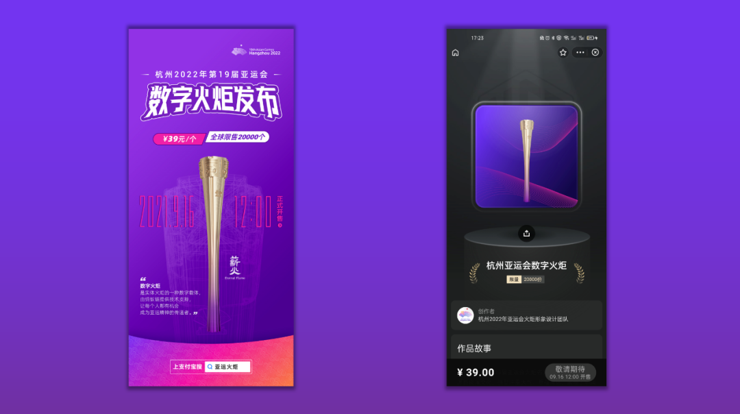 2021 年,杭州亚运会数字火炬正式发布,这是亚运会70年历史上首次发布数字特许商品,而这个“首次”任务,就落在了闫莺所在的蚂蚁链团队。