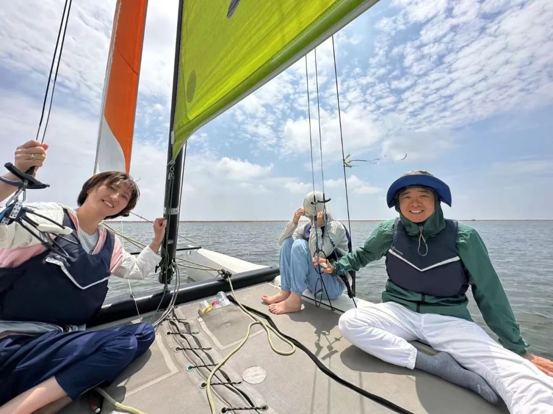 第二次参加家帆赛的富贵兰兰队舵手Liz表示,“本次家帆赛上海站的培训课时和俱乐部可用船只充足,培训可选时间段宽裕。教练的教学方法很有效,用‘迎紧顺松’‘推推拉拉’等口诀帮我们快速记忆帆船操作技巧,有趣而且更好记”。Liz提到在赛前培训中解锁的新技巧和意外惊喜,“学会了迎风转向,这是我们之前一直没有领会的一项神秘操作,随后我们发现金山城市沙滩竟然还能玩水翼!”