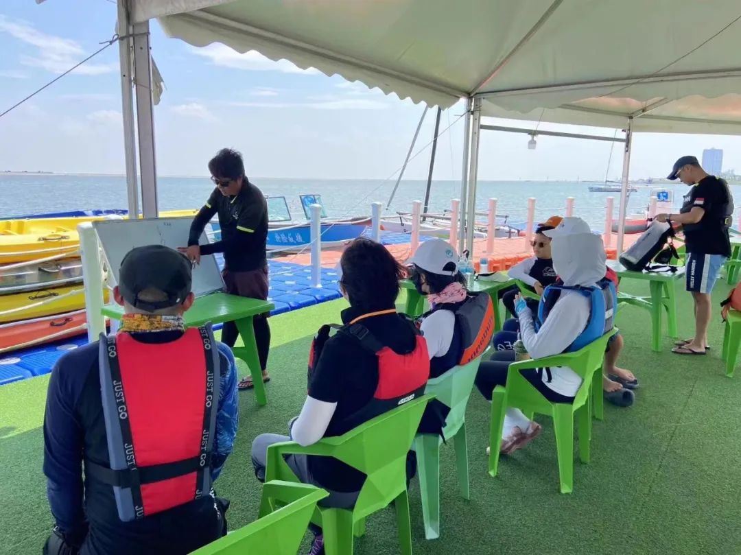 对于没有基础的小白选手,教练们会对大家进行一些理论知识的讲解,还有水上辨别风向、起航、绕标、迎风转向等方面的基础培训,“在教练评估可自行操作时,教练救生艇跟随指导,再上岸总结”。