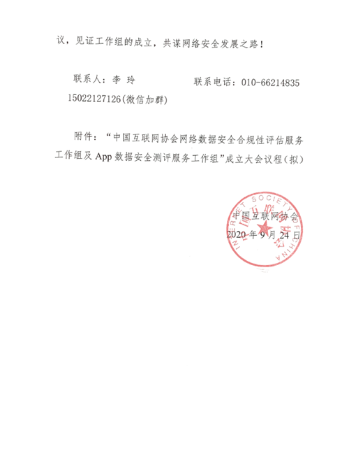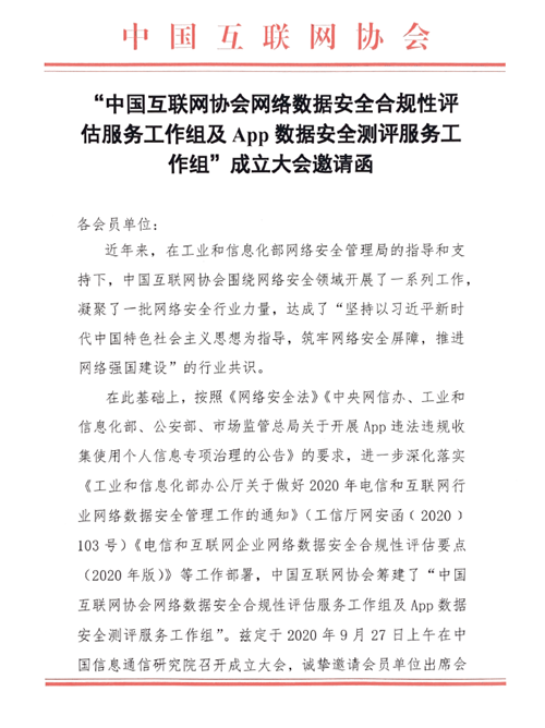在此基础上,按照《网络安全法》《中央网信办、工业和信息化部、公安部、市场监管总局关于开展App违法违规收集使用个人信息专项治理的公告》的要求,进一步深化落实《工业和信息化部办公厅关于做好2020年电信和互联网行业网络数据安全管理工作的通知》(工信厅网安函﹝2020﹞103号)《电信和互联网企业网络数据安全合规性评估要点(2020年版)》等工作部署,中国互联网协会筹建了“中国互联网协会网络数据安全合规性评估服务工作组及App数据安全测评服务工作组”。兹定于2020年9月27日上午在中国信息通信研究院召开成立大会,诚挚邀请会员单位出席会议,见证工作组的成立,共谋网络安全发展之路!