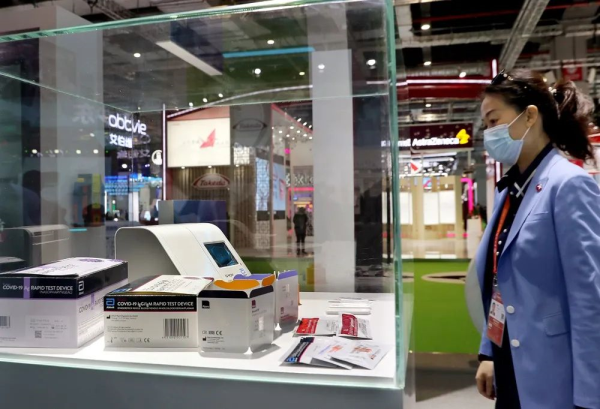 11月5日,在公共卫生防疫专区,参观者观看雅培展示的便于携带且适用于大规模检测的新冠病毒快速抗原检测试剂和产品。新华社记者 刘颖 摄