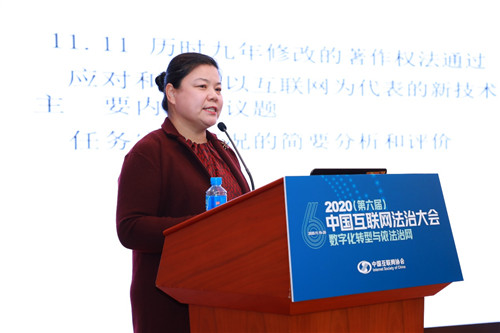 最高人民法院法官马秀荣作了题为“互联网挑战与著作权法修改”的主题演讲。她根据互联网产业发展的不同阶段,对涉网著作权案件进行了全面的回顾,并对相关案例呈现出的特点与核心问题进行了分析。她对涉网著作权案件审理中的作品属性与作品类型的判断,信息网络传播权与播放权、表演权的关系,网络侵权赔偿等难点与热点问题进行了探讨,还对著作权法如何进一步完善提出了相关建议。