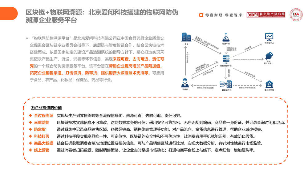 基于区块链技术的物联网防伪溯源平台是北京爱问科技有限公司在中国食品药品企业质量安全促进会区块链专业委员会指导下,结合区块链技术搭建而成。依据国家制定的建设产品追溯系统的指导方针下,精心打造实现采集记录产品生产、流通、消费等环节信息,实现来源可查、去向可追、责任可究的一个综合防伪溯源服务平台。该平台旨在帮助企业提高增加产品附加值、拓宽企业销售渠道、打击假货、防窜货、提供消费大数据技术支持等。可应用于食品、农产品、化妆品、保健品、药品等行业。也是国内首次把区块链技术应用到对外开放形的防伪溯源平台上,并不是单纯局限在某一个细分行业和领域上,对市场的兼容性比较强。