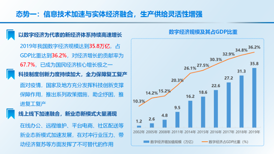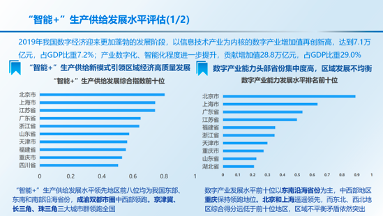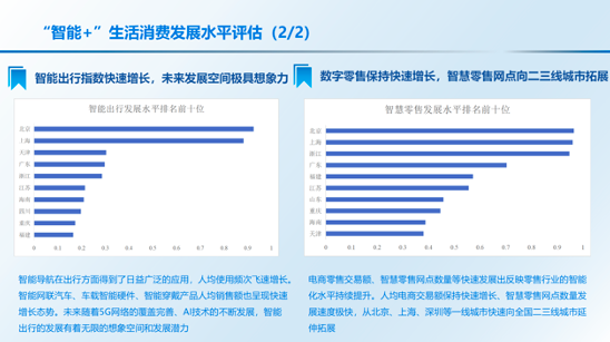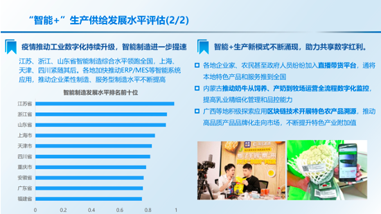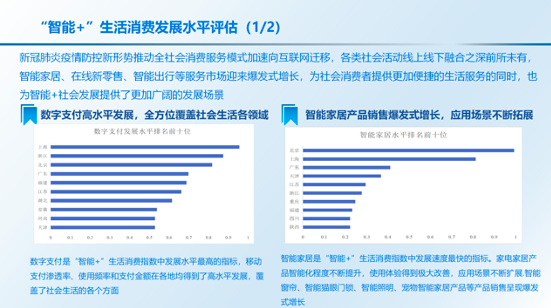 《报告》认为,疫情加速数字化转型,“智能+”对于产业发展的带动显著增强。在生产方面,疫情推动工业数字化持续升级,智能制造进一步提速。工业企业特别是行业龙头企业持续发力智能制造和工业互联网,加快推动设备换芯、生产换线、机器换人,传统工业大省智能制造能力保持稳步提升。在消费方面,新冠肺炎疫情防控新形势推动全社会消费服务模式加速向互联网迁移,各类社会活动线上线下融合之深前所未有,智能家居、在线新零售、智能出行等服务市场迎来爆发式增长,为社会消费者提供更加便捷的生活服务的同时,也为“智能+”社会发展提供了更加广阔的发展场景。