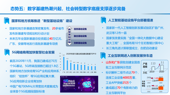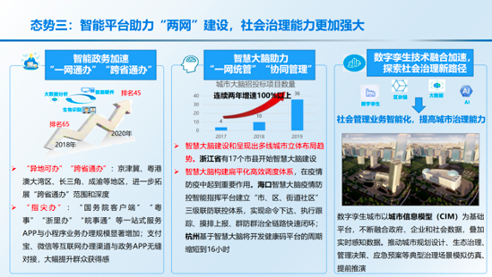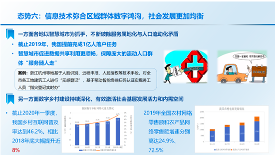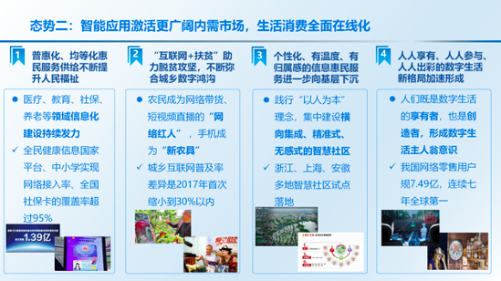 《报告》包括“智能+”生产供给、“智能+”生活消费、“智能+”公共治理、“智能+”数字基建四大部分。在生产供给方面,信息技术加速与实体经济融合,生产供给灵活性增强。科技制度创新力度持续加大,全力保障复工复产。线上线下加速融合,新业态新模式大量涌现。在生活消费方面,智能应用激活更广阔内需市场,生活消费全面在线化。普惠化、均等化惠民服务供给不断提升人民福祉,个性化、有温度、有归属感的信息惠民服务进一步向基层下沉,人人享有、人人参与、人人出彩的数字生活新格局加速形成。在社会治理方面,智能政务加速“一网通办”“跨省通办”。智慧大脑助力“一网统管”“协同管理”,数字孪生技术融合加速,探索社会治理新路径。在数字基建方面,信息通信网络充分释放社会需求,助力构建在线社会。智能融合设施加快推动产业智能化转型,应用设施部署成为高质量发展的制高点。