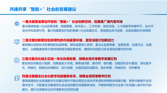 《报告》建议,共建共享“智能+”社会,需要从以下四个方面持续推进:一是营造更加开放的“智能+”社会创新空间,拓展更广阔内需市场;二是创新更加包容弹性的市场监管环境,激发深层次创新活力;三是深化城乡区域一体化协调发展,保障全民共享数字发展红利;四是健全社会化数字技能服务体系,保障全民同享数字红利。