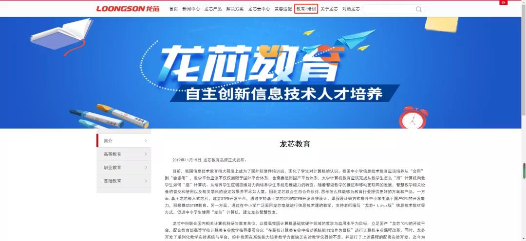 本次随龙芯教育”一同上线的还有龙芯教育大学计划、龙芯教学实验系统产品、龙芯教育主板、龙芯相关竞赛、龙芯职业教育规划及使命、龙芯信息技术基础教育、创客教育、龙芯智慧教室解决方案等,从高等教育、竞赛举办、职业教育、基础教育多个维度全面展示了龙芯教育涉猎的领域方向、技术实力、未来愿景,力争通过图文介绍,让更多的人了解龙芯教育并参与到其中,共同提高我国计算机基础软硬件领域的教学与应用水平。