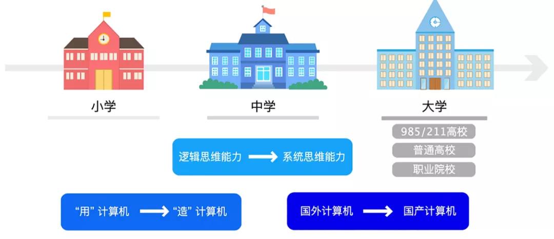 2019年,龙芯中科创立龙芯教育品牌,并发起成立创新生态教育联盟,采用腿走路策略,一方面,基于龙芯嵌入式芯片,建立STEM开发平台,通过支持基于龙芯CPU的STEM开发系统设计、课程设计等方式提升中小学生基于国产CPU的开发能力,积极推动STEM教育。另一方面,通过在中小学广泛采用龙芯电脑进行信息技术课的教学,支持老师编写+Linux版信息技术教材等方式来促进中小学生使用计算机,建立龙芯电子教室。