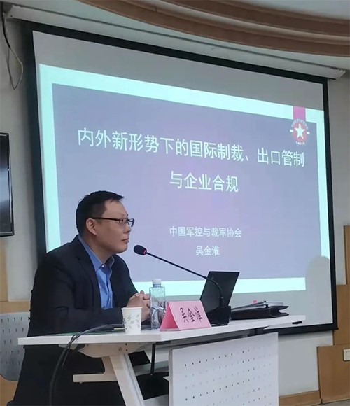 会议邀请了中国军控与裁军协会防扩散与战略贸易管控主任、研究员吴金淮作为主讲嘉宾。吴主任从内外新形势下的国际制裁、出口管制与企业合规两个层面的内容进行讲解和分享,并回应了与会代表对于国际交流、文化产品输出等问题。
