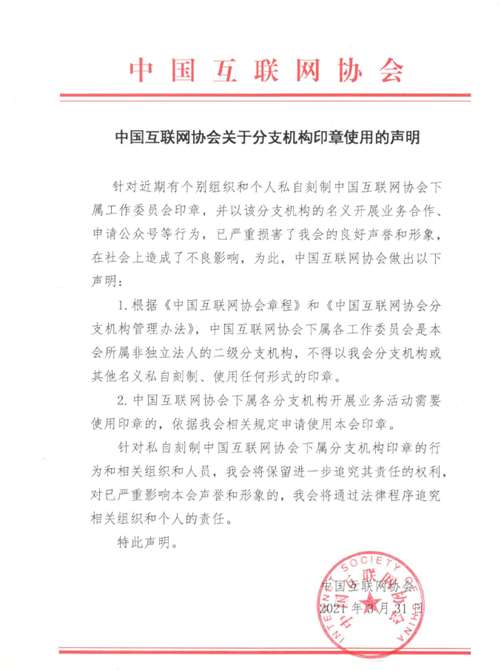 针对近期有个别组织和个人私自刻制中国互联网协会下属工作委员会印章,并以该分支机构的名义开展业务合作、申请公众号等行为,已严重损害了我会的良好声誉和形象,在社会上造成了不良影响,为此,中国互联网协会做出以下声明: