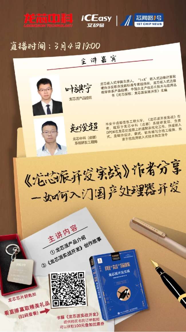 龙芯派二代自上市以来,受到了广大开发者的喜爱。为让开发者更好地了解此开发平台并快速上手实践,龙芯中科还推出了《用芯探核:龙芯派开发实战》一书。本周四(3月4日)晚上7点,我们将邀请本书主编及作者做客直播间,结合国产软硬件开发平台现状,为大家带来龙芯派二代产品深度分享,欢迎扫描下图二维码观看!在直播之前,让我们通过视频先来了解一下龙芯派二代!