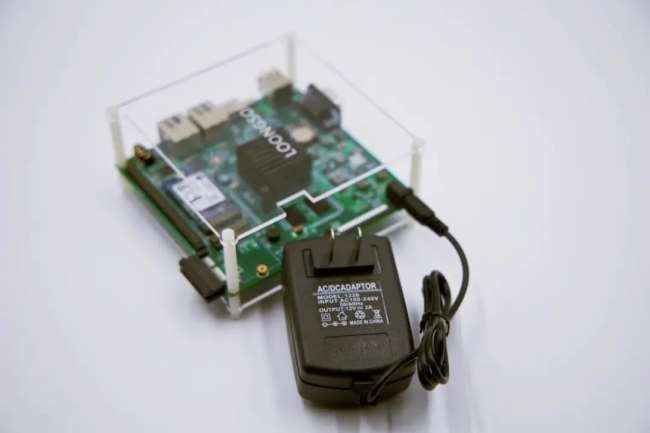 2K1000支持动态降频降压,最大功耗为5W,典型功耗为3.5W,因此采用被动散热方式,没有风扇而在芯片上贴有散热片。供电方面,龙芯派二代随机附送了12V 2A圆柱型电源。
