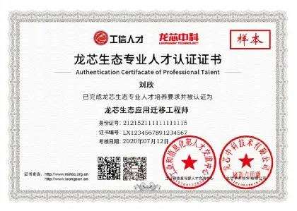参与培训并通过考核(成绩不低于60分),可获龙芯中科&工信人才联合颁发的《龙芯生态专业人才认证证书》,纸质证书于考核结束后15日内颁发,电子证书在工信人才官方网站可查询。