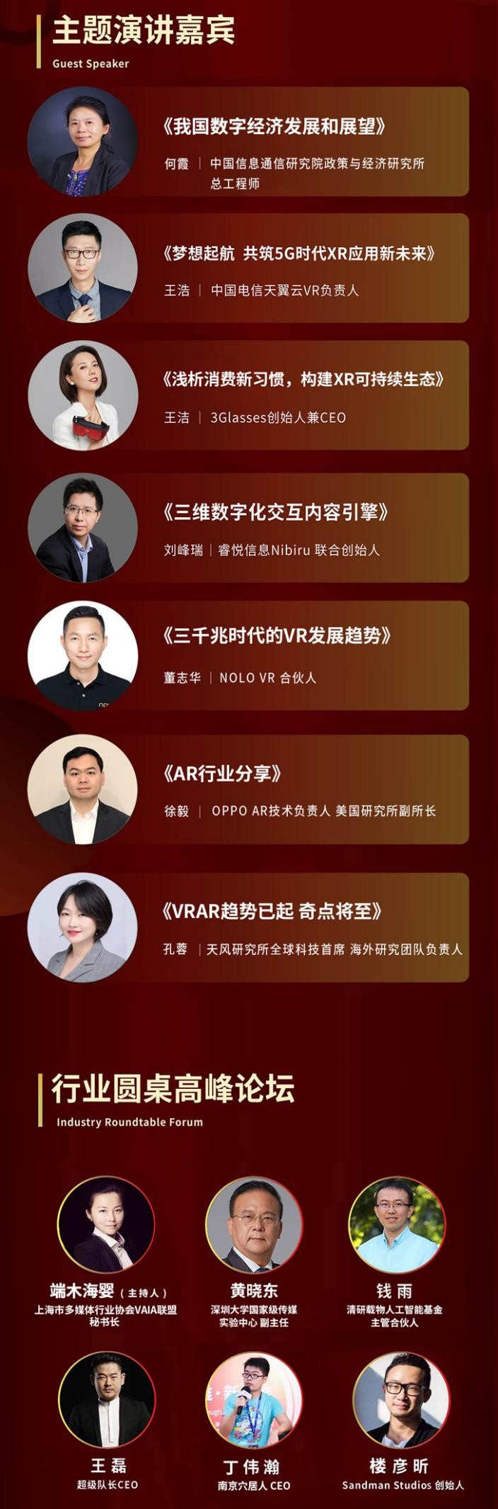 2021虚拟与增强现实产业年会暨“金V奖”颁奖盛典邀请了包括中国信息通信研究院政策与经济研究所总工程师、教授何霞,中国电信天翼云VR负责人王浩,3Glasses创始人兼CEO王洁,睿悦信息Nibiru联合创始人刘峰瑞,NOLO VR合伙人董志华,OPPO AR技术负责人、美国研究所副所长徐毅,天风研究所海外研究团队负责人孔蓉,上海市多媒体行业协会VAIA联盟秘书长端木海婴,深圳大学国家级传媒实验中心副主任黄晓东,清研载物人工智能基金主管合伙人钱雨,超级队长CEO王磊,南京穴居人CEO丁伟瀚,Sandman Studios创始人楼彦昕在内的数十位权威专家学者、投资机构代表、企业家领袖等对XR产业有深刻理解,并拥有丰富实践经验的嘉宾,将带来一场“超有料”的分享。