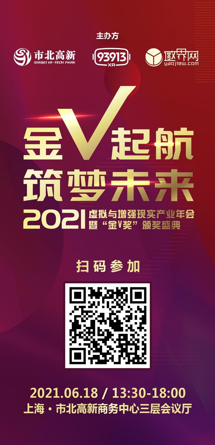 6月18日,由上海市北高新股份有限公司、93913、邀界网共同主办的2021虚拟与增强现实产业年会暨“金V奖”颁奖盛典将在上海市北高新商务中心隆重启幕。