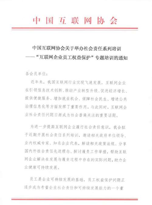 为进一步提高互联网企业履行社会责任意识,我会拟于近期开展社会责任系列培训,邀请相关政府单位领导、业内权威专家、知名企业代表,解读相关政策法规、分享国内外社会责任先进理念、探讨履责工作举措,帮助互联网企业解决在发展与履责过程中存在的实际问题,助力企业健康可持续发展。