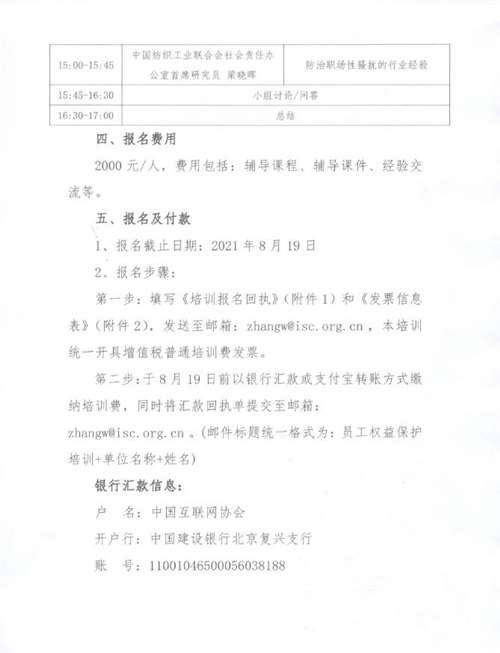 第二步:于8月19日前以银行汇款或支付宝转账方式缴纳培训费,同时将汇款回执单提交至邮箱:zhangw@isc.org.cn 。(邮件标题统一格式为:员工权益保护培训+单位名称+姓名)