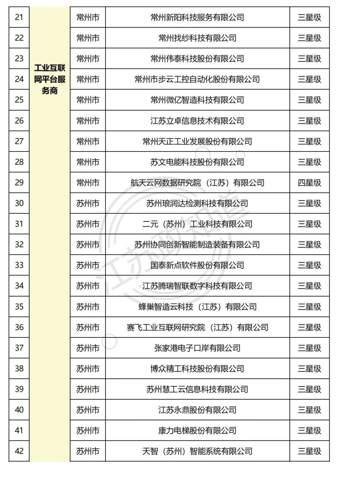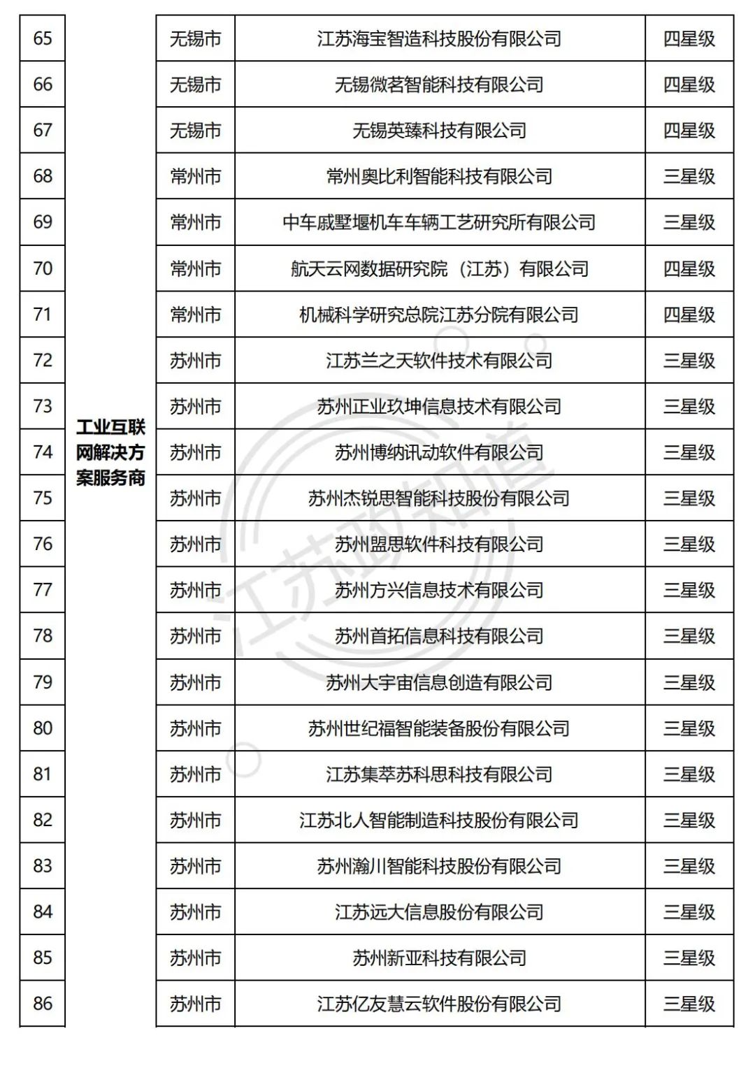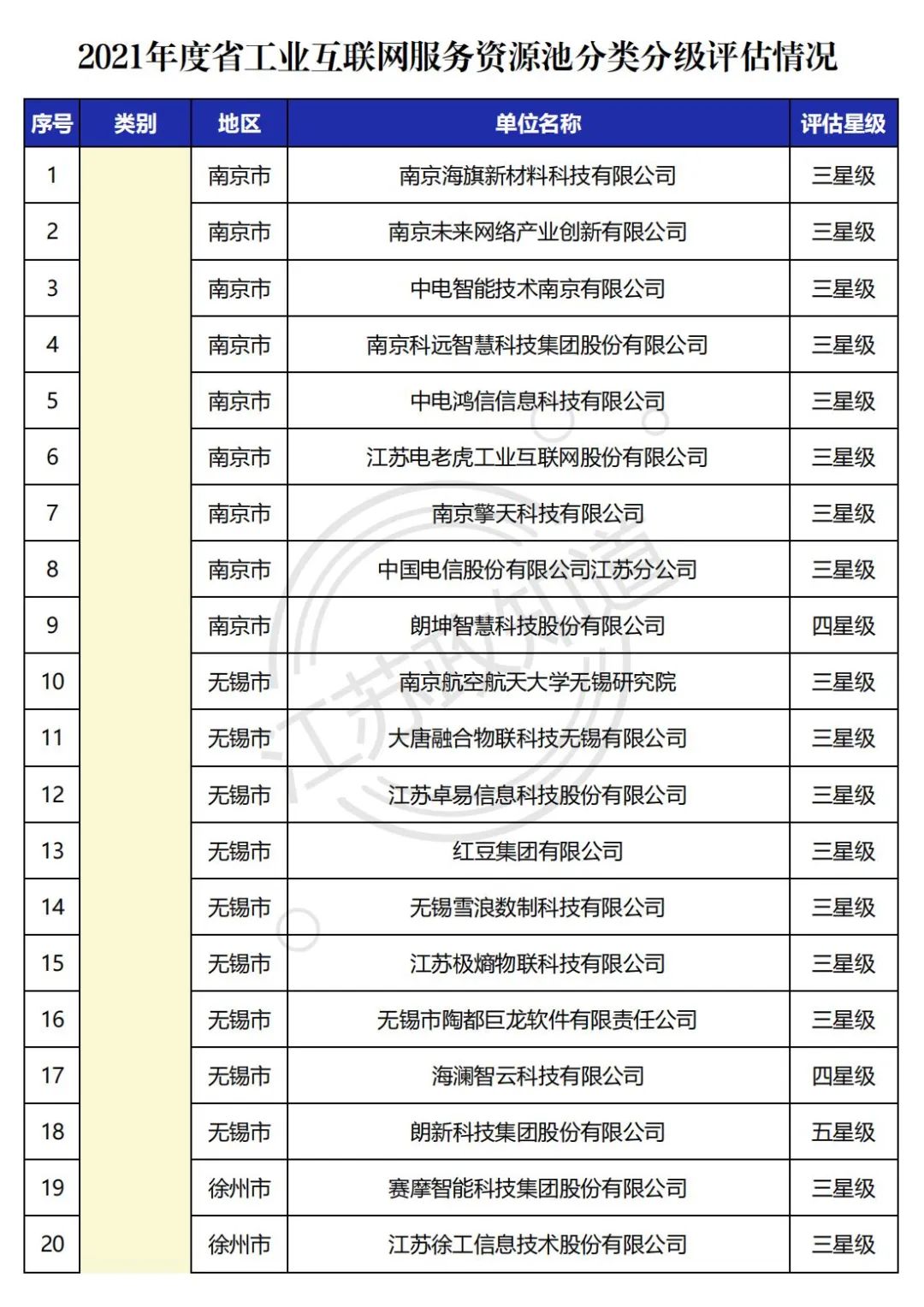 为贯彻落实《江苏省加快推进工业互联网创新发展三年行动计划(2021—2023年)》《江苏省“十四五”信息化和工业化深度融合发展规划》,加快培育优秀的工业互联网服务商,强化资源池分类分级建设,前期江苏省工信厅组织开展了充实和加强江苏省工业互联网服务资源池建设工作。现将申报企业分类分级评估的结果予以公布,供工作参阅。