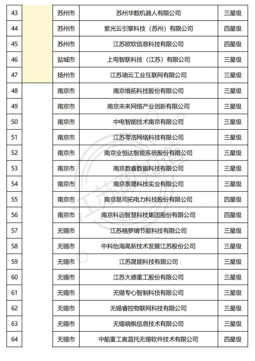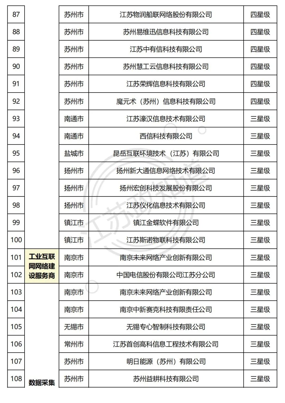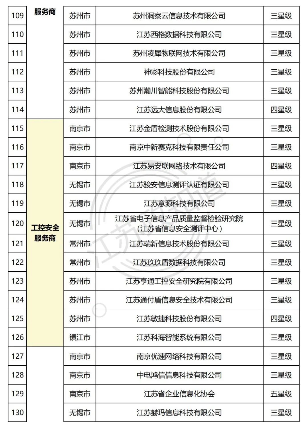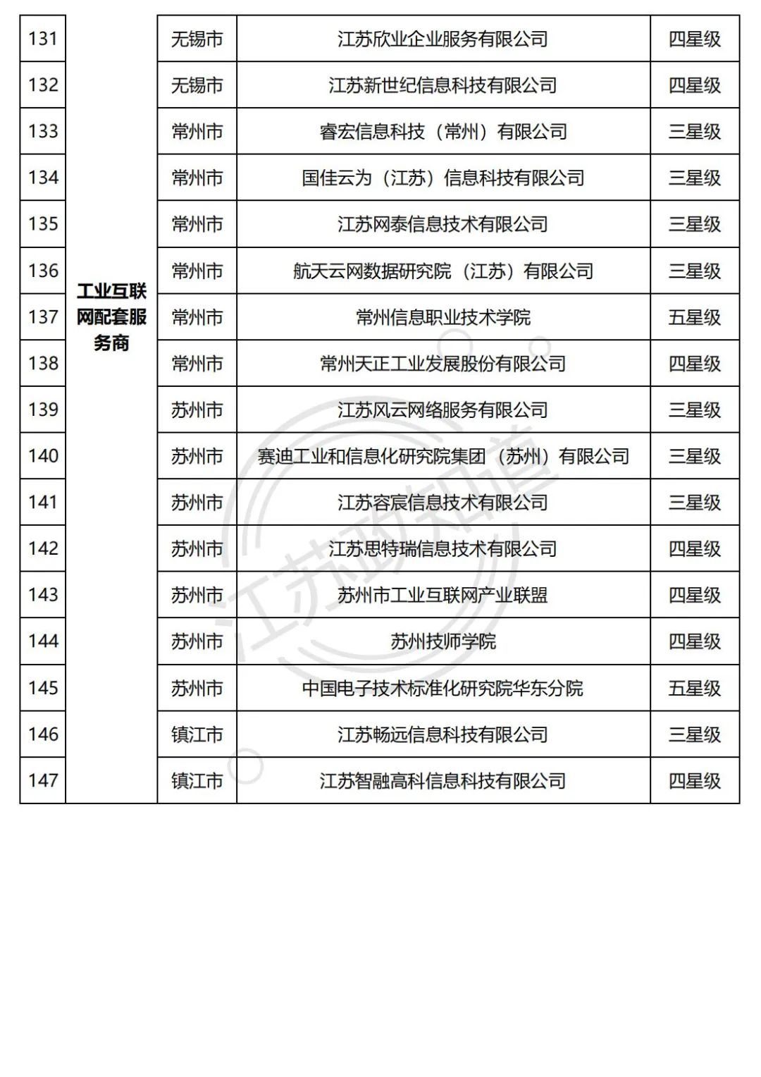 为贯彻落实《江苏省加快推进工业互联网创新发展三年行动计划(2021—2023年)》《江苏省“十四五”信息化和工业化深度融合发展规划》,加快培育优秀的工业互联网服务商,强化资源池分类分级建设,前期江苏省工信厅组织开展了充实和加强江苏省工业互联网服务资源池建设工作。现将申报企业分类分级评估的结果予以公布,供工作参阅。
