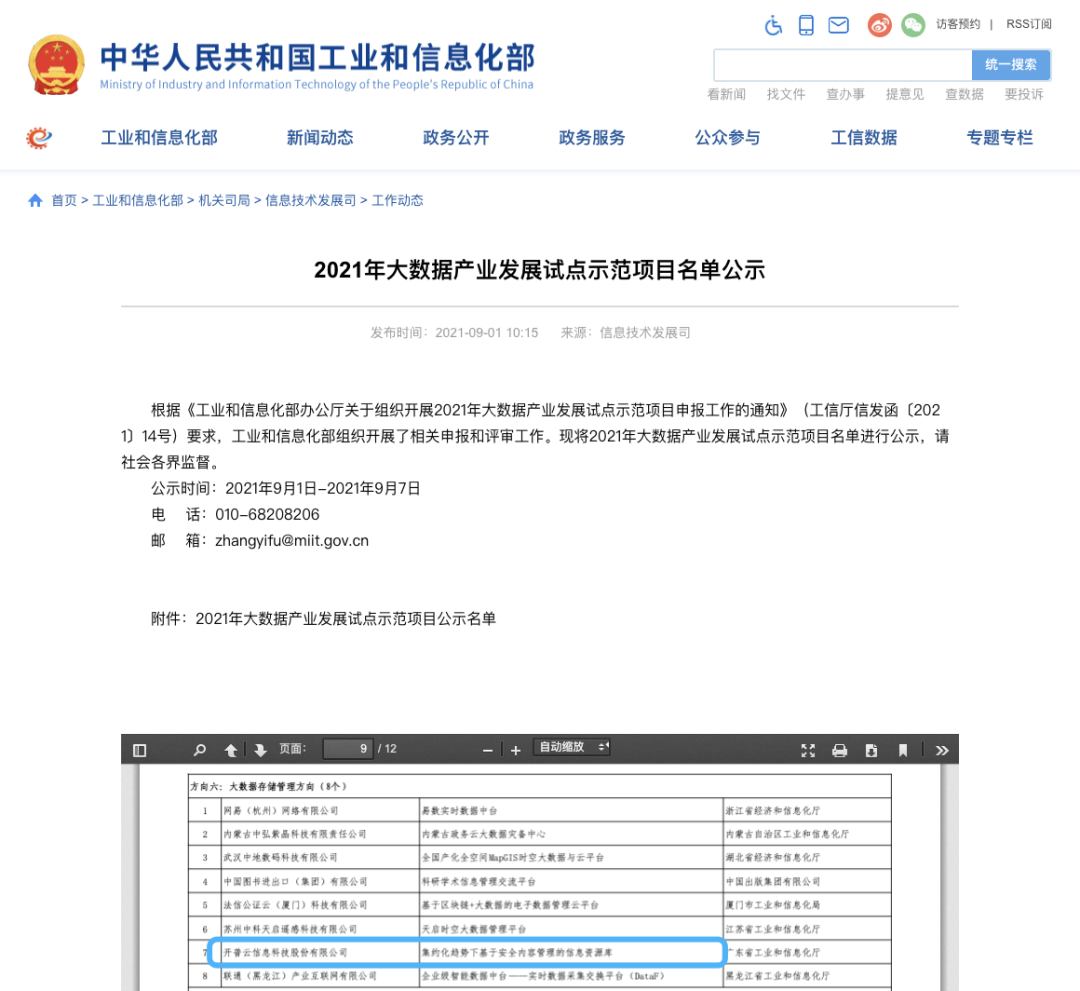 日前工业和信息化部正式发布了《2021年大数据产业发展试点示范项目名单》,开普云公司的“集约化趋势下基于安全内容管理的信息资源库”成功入选大数据重点产品。