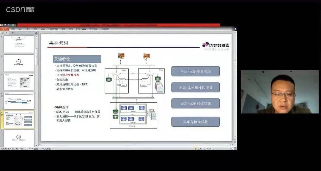 9月24号由CSDN主办的CSDN在线峰会——数据库新时代如期开展,本次在线峰会聚焦于技术干货,从开发者关注的技术痛点出发,分享性能优化、架构设计、系统实现等技术层面的方法论,旨在为开发者提供真正“学到”“用到”的实操经验。武汉达梦数据库股份有限公司技术专家受邀发表《如何攻克缓存技术难题,实现共享存储集群》主题演讲。演讲内容见下文: