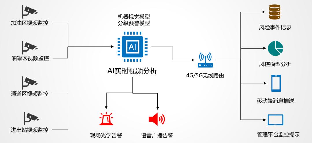 # 二道门、关键卡口处 当人员进入生产区域时,结合二道门及关键卡口处的摄像头信息,通过平台智能算法,对未戴安全帽、未穿长袖长裤等不安全行为进行实时预警,平台大屏同步实时预警并弹出该区域监控画面。 # 作业现场 通过移动布控球对现场高危作业进行实时监控,通过平台智能算法实时分析现场布控球视频监控数据,对作业过程人员的不安全行为进行报警提醒,并同步在平台大屏幕上弹出布控球监控画面。 #重点监管场所 针对储罐区、库区、危废场所、危险化工工艺生产等重点监管场所,结合现场监控摄像头信息,通过平台智能算法实现对重大危险源、生产装置面临故障、火焰、烟雾的实时预警,并通过平台大屏实时弹出该区域监控画面。 # 中控室 对中控室等关键岗位进行视频监控,通过平台对所安装摄像机进行算法分析处理,自动对中控室内脱岗、睡岗、玩手机等行为进行实时报警,并同步在平台大屏幕弹出该区域监控画面。