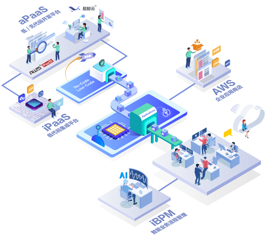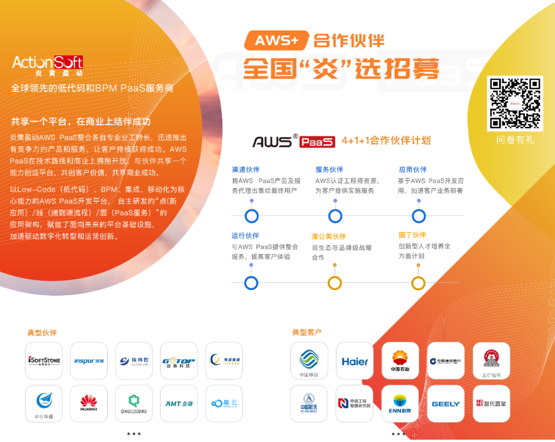 产品布局上提供了面向大中型组织的AWS PaaS和面向成长型组织的易鲸云,为AWS+不同规模的伙伴、不同数字化转型需求的客户,提供了支撑不同发展阶段的数字化平台底座。持续为伙伴提供收益,为用户提供服务。