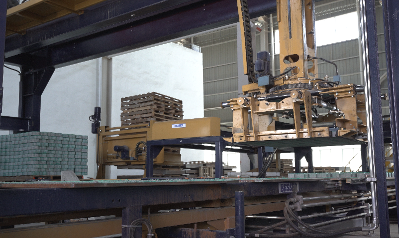 绿建集团旗下的西安建中管业有限公司引进的全自动砌块生产线,采用先进的电气、液压、控制系统及高强的机械框架结构,使之具备良好的稳定性、可靠性及耐久性等。正常生产工作中,全线仅需5名操作人员,即可达到最高每小时生产透水砖11000块、砌块每小时最高180板的效率,全线最大功率400千瓦时,相同产量下较其他小型生产线大量节约了能耗,废料回收装置可以达到零废料。同时,该生产线可以满足用户生产不同种类产品的需求,如可以生产彩色地面砖、挡土墙砖、承重砌块、普通砌块、彩色面劈裂砌块和普通劈裂砌块以及用于高速公路、铁路、河道坡岸等路坡护理工程的坡堤砖、连锁护坡砖、咬接式水土护垫等系列产品。