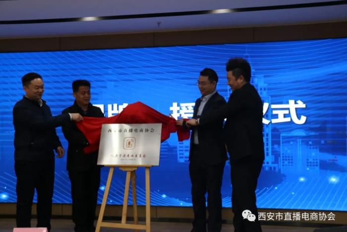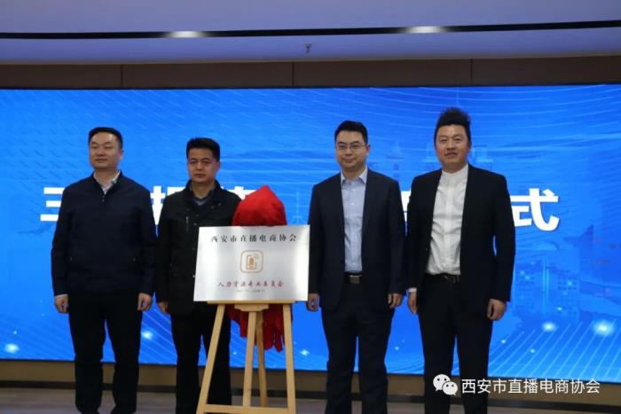 西安市电商处处长铁红兵、西安市直播电商协会会长杨森然、陕西新才控股股份有限公司法人孙鹏、陕西新才控股股份有限公司彭庆晗共同为人力资源专业委员会的成立进行了揭牌。