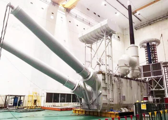 ZZDFPZ—415000/750—800换流变压器是网侧750kV、阀侧±800kV的大容量换流变压器,用于“陕北—武汉±800kV特高压直流输电工程”。通过优化设计,采用网侧引线外置,适形油箱等设计满足了巨型换流变压器铁路运输的要求;通过工艺攻关,提高了产品的制造水平和产品质量,产品具有局放低、损耗低、温升低、噪声小、结构紧凑等特点,其主要性能指标达到同类产品的国际领先水平。
