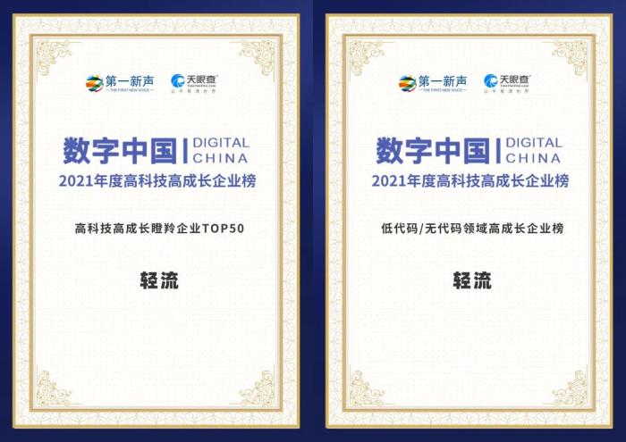 会上,「2021年度高科技高成长企业榜」公布,轻流登榜「高科技高成长瞪羚企业TOP50」以及「低代码/无代码领域高成长企业榜」。本次年度企业榜单基于「天眼查」大数据优势,整理与收集近千家候选企业数据信息,邀请来自不同领域的甲方高管、产业专家和投资大咖,以及十余家一线投资机构投资人与数据库平台专家担任评委,从多维度展开评选,并结合数据调研,综合评选得出。
