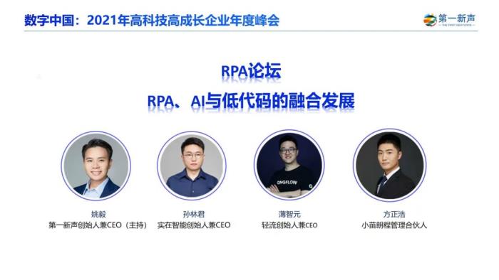 本次峰会设置了「RPA、AI 与低代码的融合发展」圆桌论坛环节,轻流CEO薄智元受邀出席此次论坛,与小苗朗程管理合伙人方正浩、第一新声创始人兼CEO姚毅、实在智能创始人兼 CEO 孙林君等业界专家一起,共议低代码/无代码跟 RPA 等先进技术的融合以及未来发展趋势。