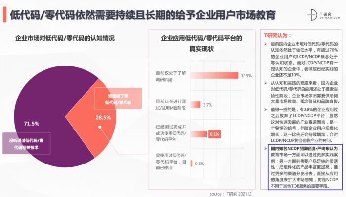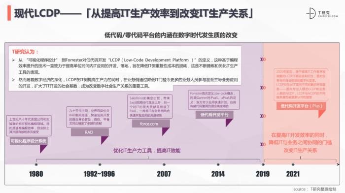 近日,“人称T客”旗下智库品牌T研究发布《2021中国低代码/零代码全景产业研究报告》(以下简称“报告”),深入分析低代码和无代码赛道实践,阶段性回顾产业发展,系统性预测行业可见未来。