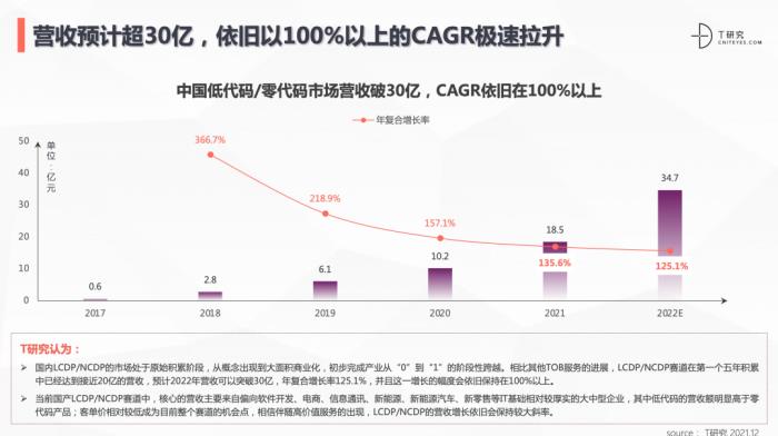 无代码/低代码开发赛道在第一个五年积累中已经达到接近20亿的营收,预计2022年营收可以突破30亿,年复合增长率125.1%,报告预测这一增长的幅度会依旧保持在100%以上。
