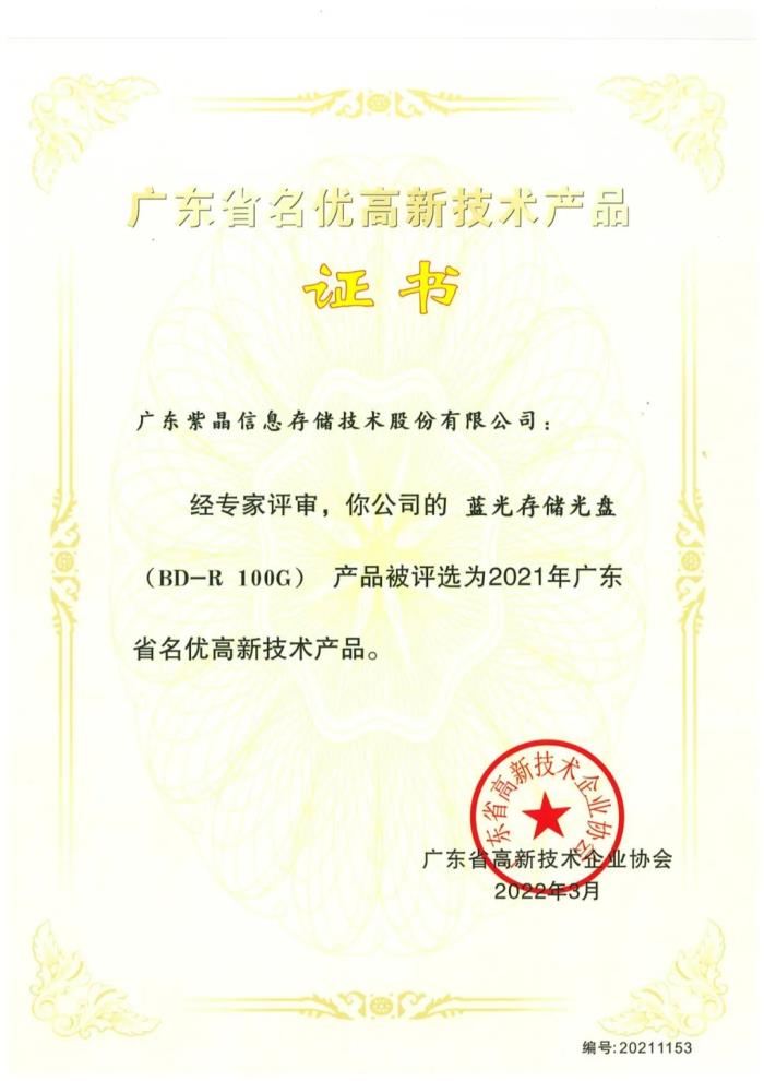 企迪网讯(编辑刘欣)近日,紫晶存储的蓝光存储光盘(BD-R 100G)产品被正式评选为广东省名优高新技术产品,广东省高新技术企业协会向紫晶存储颁发了认证证书。此次认证,也代表了政府和行业对紫晶存储企业实力及产品的认可。