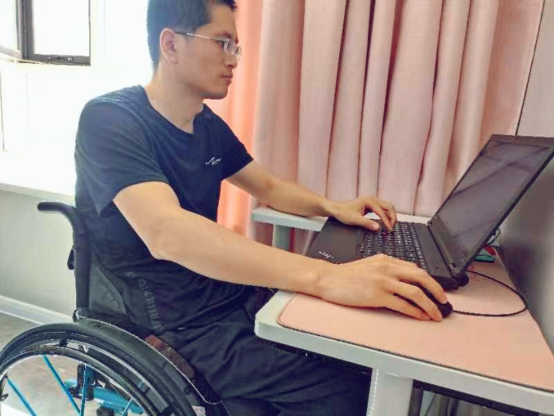 范丙来自陕西榆林,18 岁时,由于突发脊髓肿瘤,范丙不得不坐上了轮椅。从此,奔跑、跳跃,这些健全人习以为常的动作都开始与他无缘。