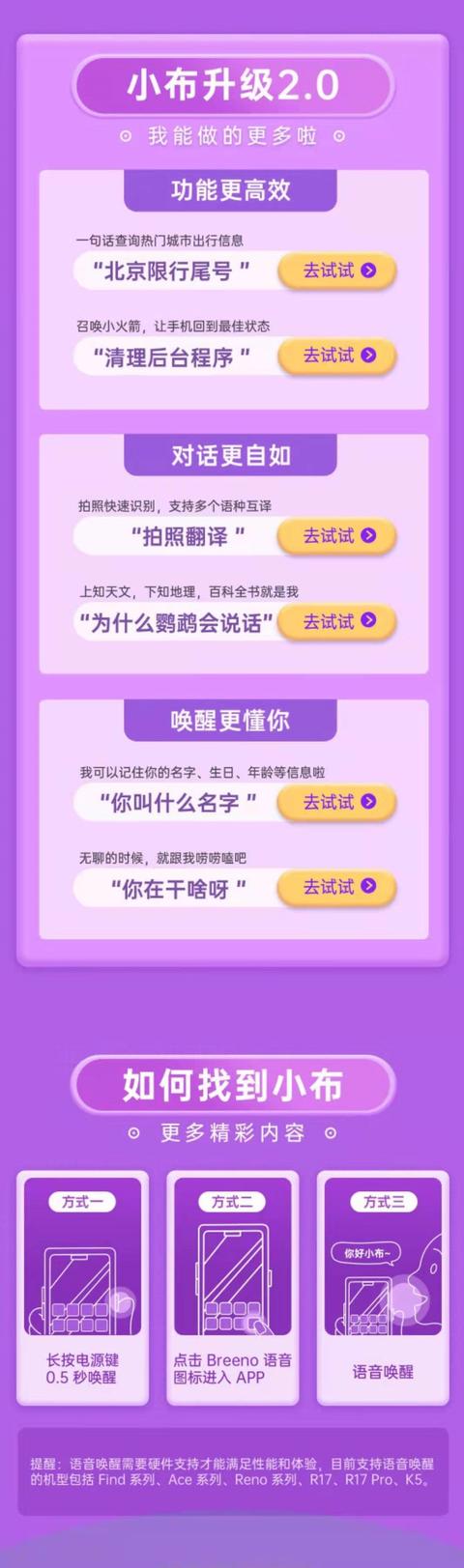 通过全场景智能协同,小布助手可为用户带来多设备跨场景的灵活应答和执行能力。小布助手在出行方面,支持热门城市限行信息查询;在生活方面,支持多种彩票开奖结果查询,以及星座运势、星座信息、星座配对、幸运属性等相关查询;在休闲娱乐方面,直达短视频(快手、抖音)及直播(虎牙、斗鱼)等多个娱乐类头部APP,成为第一家全部实现以上能力的语音助手。不仅如此,它还支持听歌识曲,让美好音乐不再错过。