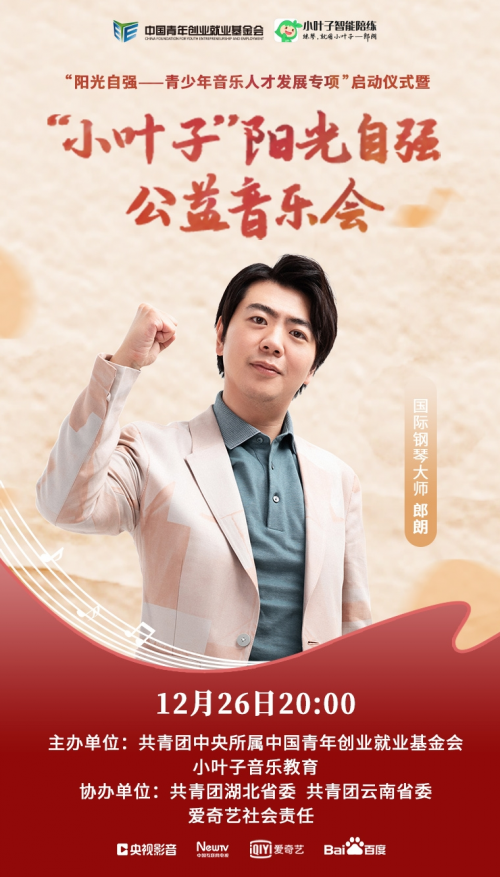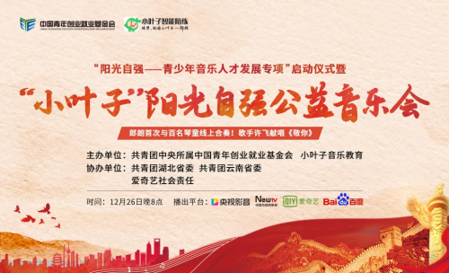 “小叶子”阳光自强公益音乐会是此次项目的重要部分,将于12月26日晚在央视影音、百度、爱奇艺等平台直播。钢琴大师郎朗、世界著名童声合唱团、青年歌手、抖音钢琴小达人等将带来精彩节目。