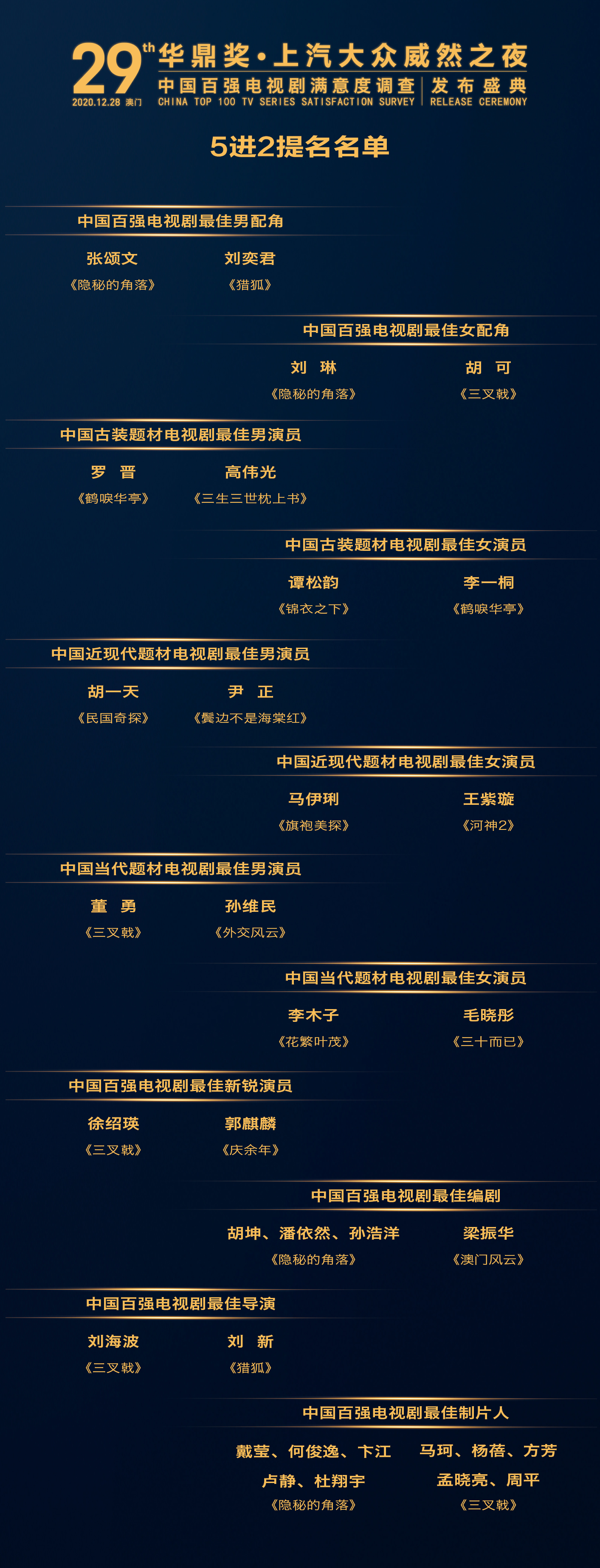 12月23日,华鼎奖集团在澳门公布了第29届华鼎奖上汽大众威然之夜中国百强电视剧满意度调查各大奖项提名名单“五进二”观众网络投票结果,综合华鼎奖多个官方网络平台票数统计显示,张颂文和刘奕君在最佳男配角的角逐中脱颖而出,胡可和刘琳在最佳女配角的竞争中票数领先。其他各个奖项前两名也各有归属。备受关注的全国观众最喜爱十佳演员名单,将在下次公布。