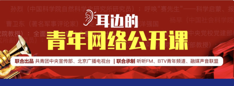 在五四青年节期间,我们为青年朋友带来了《耳边的青年网络公开课》,这是我们为年轻人送上的一份音频大礼包。“吹响冲锋号角,不负青春韶华”,《耳边的青年网络公开课》通过“全面建成小康社会”、“探寻中华文明源头”“21世纪中国的马克思主义”“重读《新青年》,倾听爱国心”等八个主题,邀请八位学者以国际视角、专业知识,以“音频云课堂”形式,结合年轻人关心、关注的热点、重点话题进行“授业解惑”,引导青年理性认知,倡导科学思考。