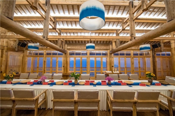 月亮山居民宿群共有11栋,民宿9栋,其余两栋分别为餐厅和功能厅。民宿群坐落于寨子的上方。山中寨民向来注重村子的气脉,外来民宿群往往不被允许建在村落的上方。建造方和寨民允诺不大拆大建,多是民居改造。随着施工的进展,寨民看着民宿群一天天起来,文旅的理念也一步步被寨民理解,“我们也希望寨子发展好嘛”。与寨民的和合相处,也使得民宿群在热望中落成。建设的过程,其实也是新村民与原住民融合的过程,“大家是一种互相学习借鉴的状态,传统民居叠加现代设计,其实最后是心与心的交流”,细数建设过程,建造方颇为感慨。