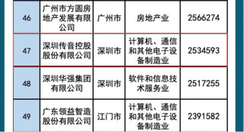 传音控股位居“广东省民营企业百强榜”第47位