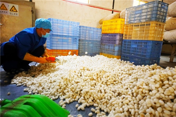 一批蚕宝宝从幼虫到吐丝,只要12-15天时间,基地养殖周期非常短,合作总社与各分社及农户签订协议,蚕茧由合作总社统一收购,一个家庭一年可以养蚕12批次,每批次3万蚕,年收入可达11万元。