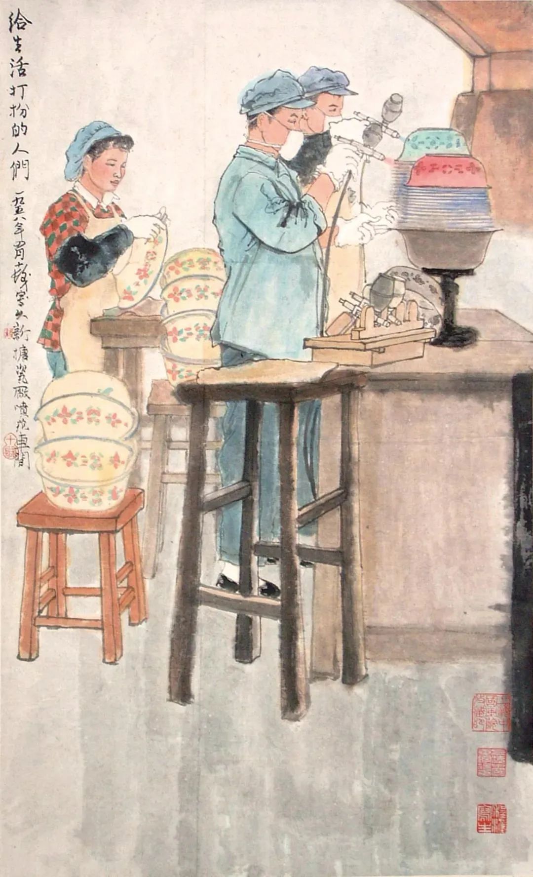 新中国成立初期,面对社会翻天覆地的变化,程十发欣喜兴奋,创作了一批以美好现实生活为题材的作品。此次展出的《歌唱祖国的春天》,是程十发主题画创作的代表作,也是他的成名之作,作品荣获了1957年第一届全国青年美术作品展览一等奖。还有《给生活打扮的人们》《搪瓷脸盆画稿》等一系列作品是1958年上海中国画院组织画师去上海久新搪瓷厂深入生活时所作。这些作品不仅可以勾起观众对过往年代的回忆,更能让人们感受到画家发自内心对新生活的热爱之情。为美好生活而创作的初衷,即使在今天依然适用,依然让人心生美好。
