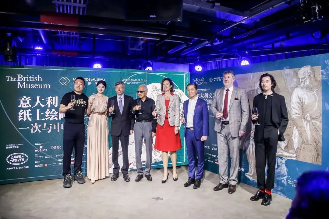 ▲ “意大利文艺复兴纸上绘画:一次与中国的对话”展览开幕现场,2021年9月10日,木木美术馆(钱粮胡同馆),北京,(从左至右)林瀚、雷宛萤(晚晚)、范迪安、靳尚谊、吴若兰(Dame Caroline Wilson DCMG)、潘庆、李大龙(Richard Shore)、王宗孚(Victor Wang)
