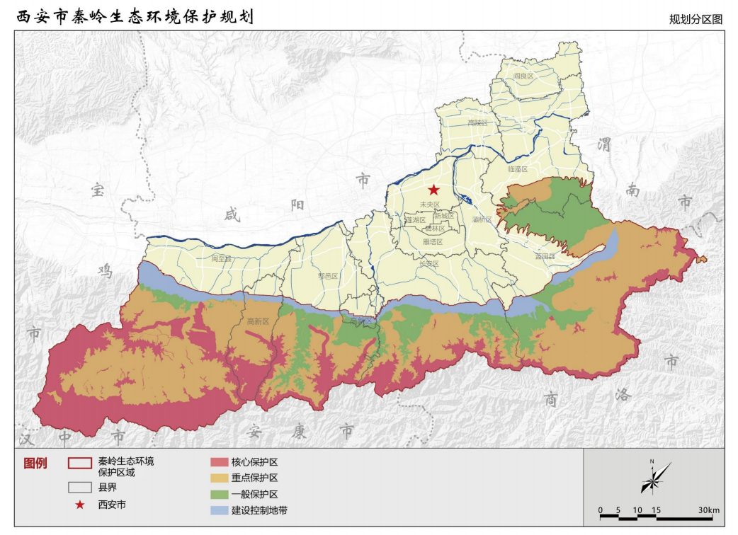 秦岭范围外围划定建设控制地带,东、西以市界为界,南以秦岭范围北边界为界,北以周至县、鄠邑区、长安区行政区域内省道 S107以北 1 公里线—蓝田县行政区域内省道 S107 连线为界的区域。这一区域严格执行法律、法规和省、市人民政府对建设活动的限制要求,依法采取相应的生态环境保护措施,保障秦岭生态功能不降低。严格控制建设活动的空间范围和规模,严格控制建筑的高度和密度。